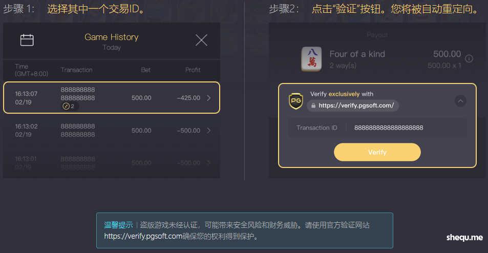 为了保障玩家和运营商的权益,我们推出了一种简便的验证方法。玩家可以通过交易记录轻松识别官方游戏。选择官方游戏可确保更安全、更高质量的游戏体验,并有助于避免潜在的风险和损失。我们强烈建议玩家验证他们正在玩的游戏是否为官方版本。请务必识别正版产品以保护您的权益,以便您继续享受 PG 游戏。
